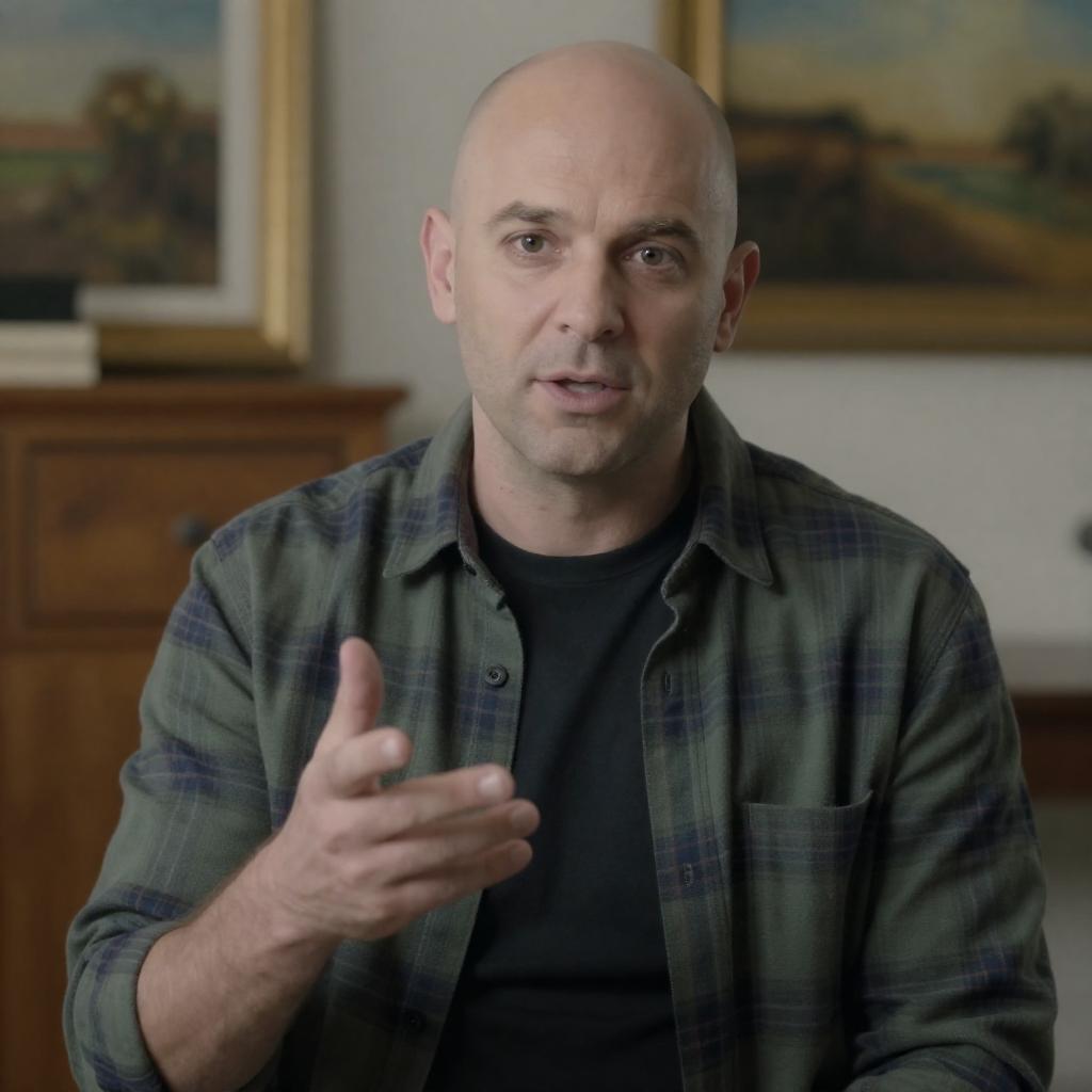 Bald man with light skin, smiling, sitting on a dark gray couch. He wears a plaid shirt over a yellow shirt. A red pillow is on the left. He looks slightly to the right. His right arm rests on his lap.