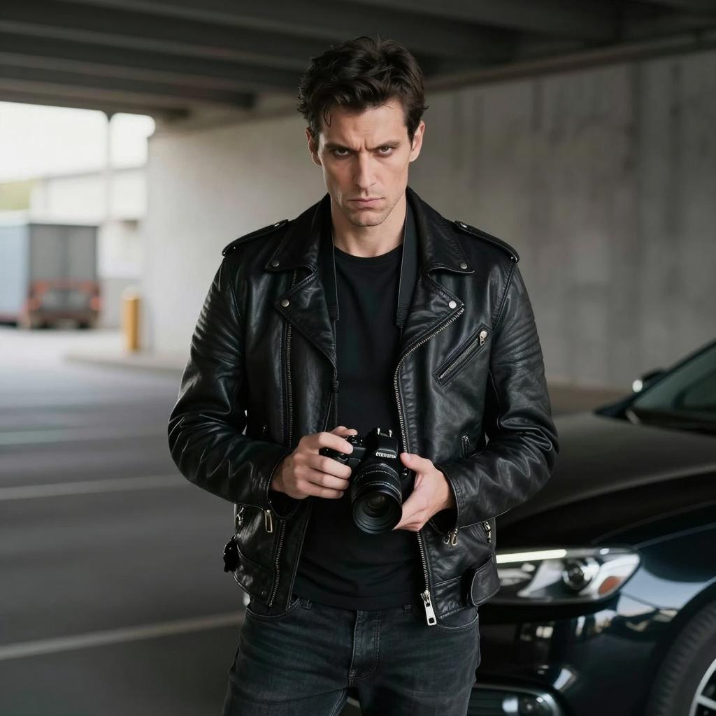 Man with short dark hair in dark leather jacket with wing emblem, wearing black shirt, opens car door with right hand. Dimly lit garage with metallic beams and red lighting in background. Intense side profile.