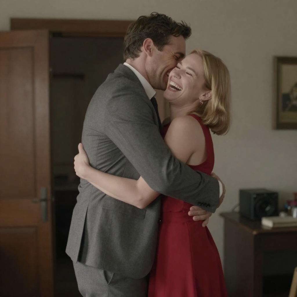 A man and woman share a tight, joyful hug indoors. The man wears a gray suit and has short brown hair. The woman has blonde, bobbed hair and wears a red sleeveless dress. They are laughing in a dimly lit rustic room featuring a worn wooden door and scattered equipment in the background.