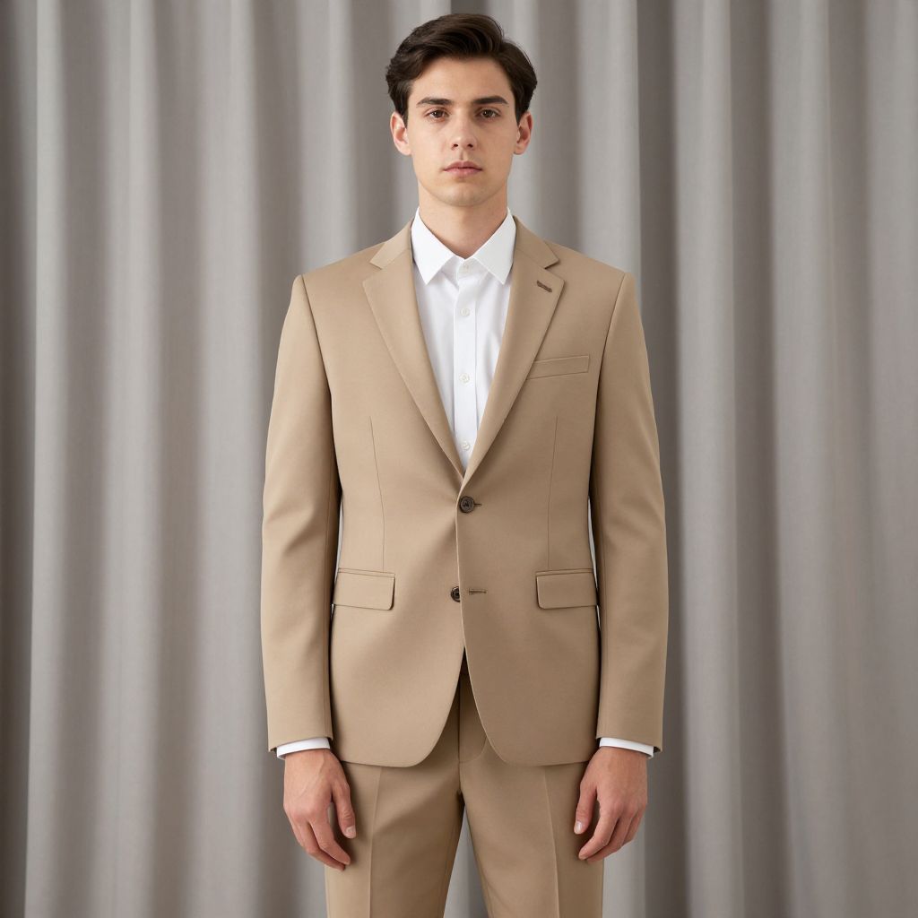Basic Clothing Costume, man standing in front of a curtain wearing a tan suit