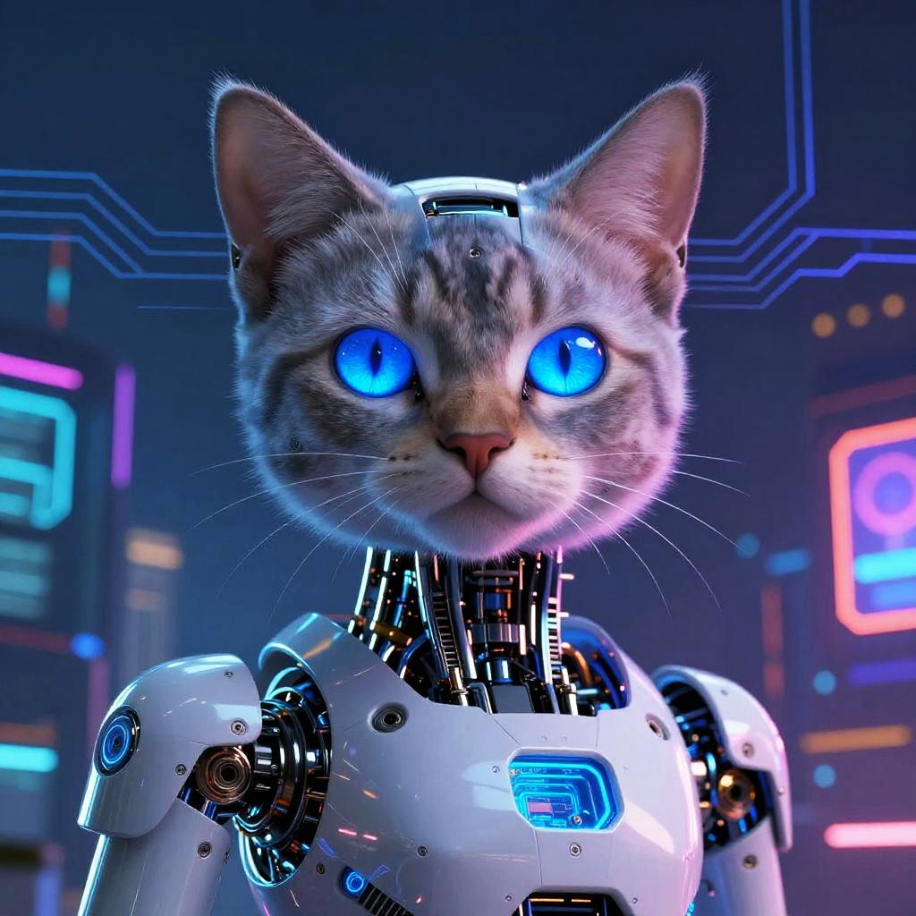 AI cat art, a futuristic digital painting of a sleek robotic cat with glowing blue eyes, surrounded by neon circuitry and vibrant cyberpunk cityscape in the background, intricate details, high contrast, sci-fi atmosphere
