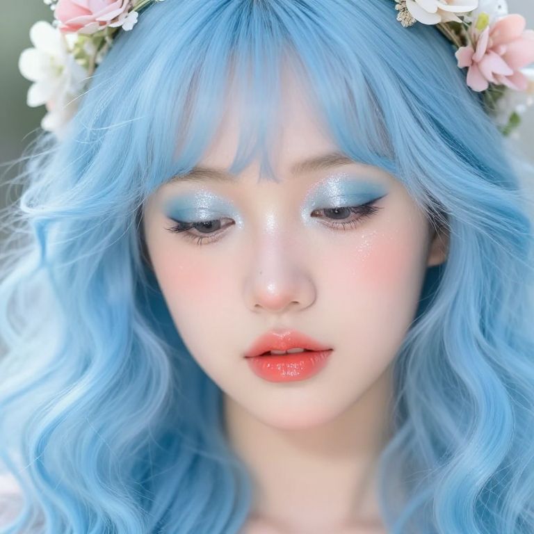 Makeup with blue hair, pastel icy blue curls surrounding a face with ethereal glittery eyeshadow, shimmering highlighter on cheekbones, glossy coral lips, floral crown accessory, soft-focus fantasy portrait with gentle natural light.