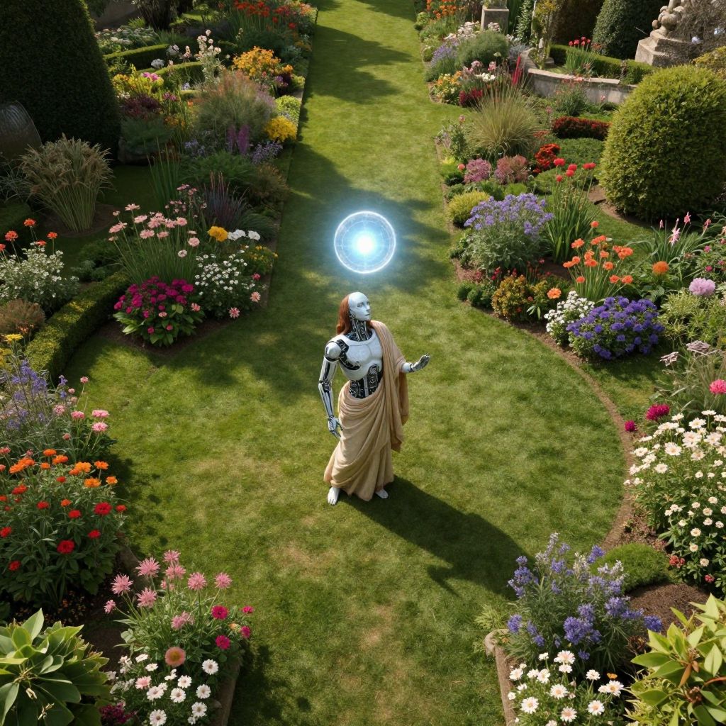 Photograph of a lush garden with vibrant flowers in red, yellow, white, and purple. A humanoid robot with silver armor and a white headpiece walks down a green grass path. The robot wears a beige toga-like garment and holds a glowing blue orb in its right hand. The garden is well-maintained with various shrubs and trees, and sunlight casts shadows. The robot's futuristic design contrasts with the natural beauty of the garden, creating a surreal, sci-fi aesthetic. The composition is symmetrical with the path leading straight to the robot.