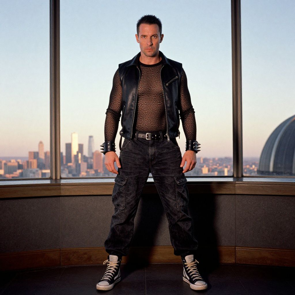 Photograph of a muscular man with short dark hair, wearing a black mesh shirt, leather vest, cargo pants, and Converse sneakers, standing in