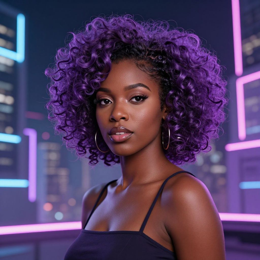 Photorealistic digital portrait of a dark-skinned woman with vibrant purple curly hair, wearing a black spaghetti strap top, against a neon-lit city