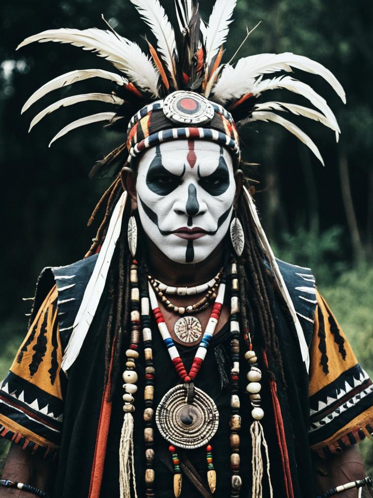 Man in Witch Doctor Costume, photorealistic tribal cosplay portrait, cinematic realism