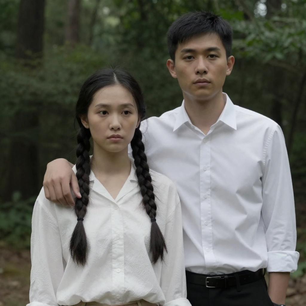 Silhouetted couple holding hands on grassy hilltop, facing each other. Man with muscular build, woman in white dress. City skyline with tall buildings in background. Overcast sky. Man's face not visible, woman's face slightly turned. Both stand on grass.