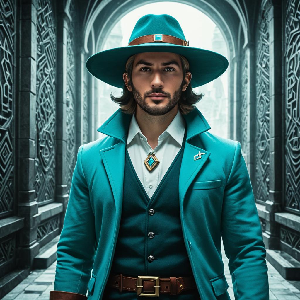 Realistic photo.White male hacker, mysterious, Carmen Sandiego inspired, teal and silver, in the style of Legend of Zelda Breath of the Wild, highly detailed background, ultra-realistic, hyper-detailed 8k