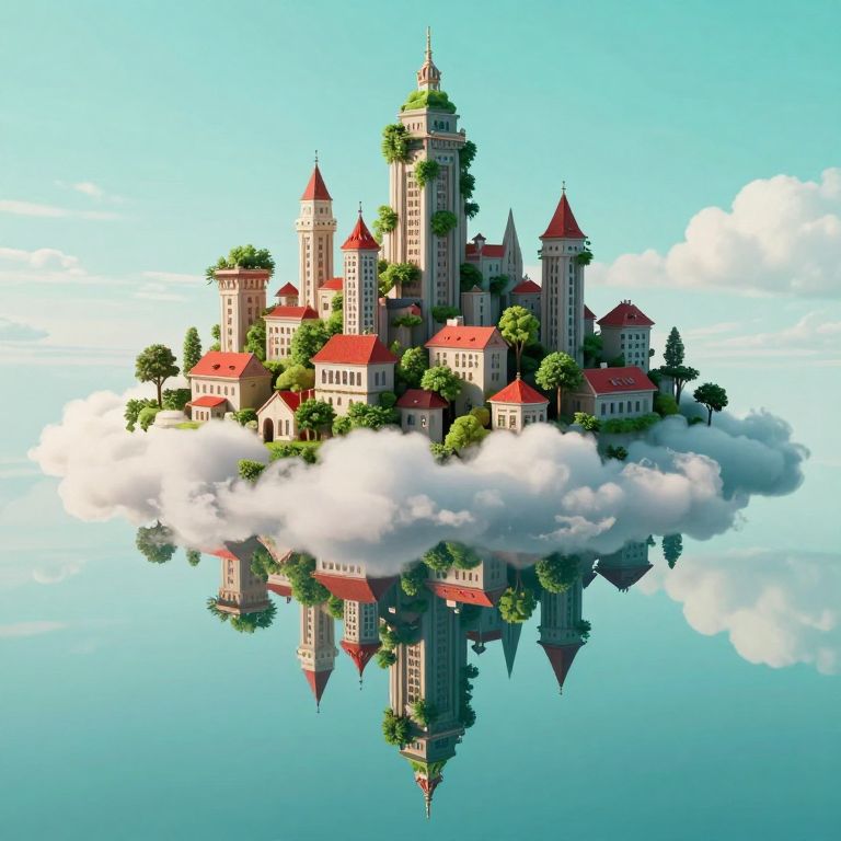 A fantastical 3D-rendered cityscape floats serenely above the clouds, its multi-tiered structures adorned with lush greenery and vibrant red roofs, defying gravity as it mirrors perfectly in a tranquil turquoise sky below, creating a surreal, dreamlike environment reminiscent of a high-definition digital artwork by M.C. Escher.