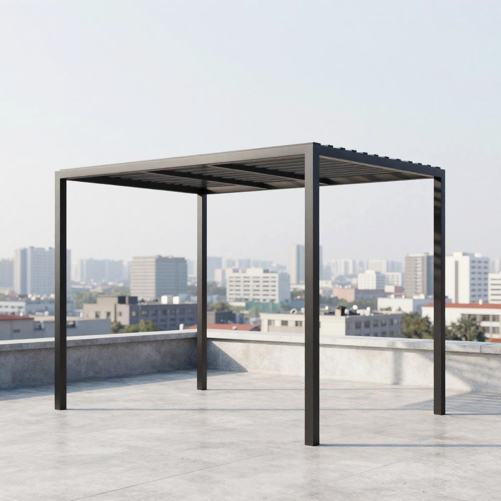 Minimalist pergola made of black metal with sharp geometric shapes, placed on rooftop terrace, panoramic cityscape background, minimalist outdoor decor, subtle shadows, cool color scheme, ultra-detailed architectural visualization