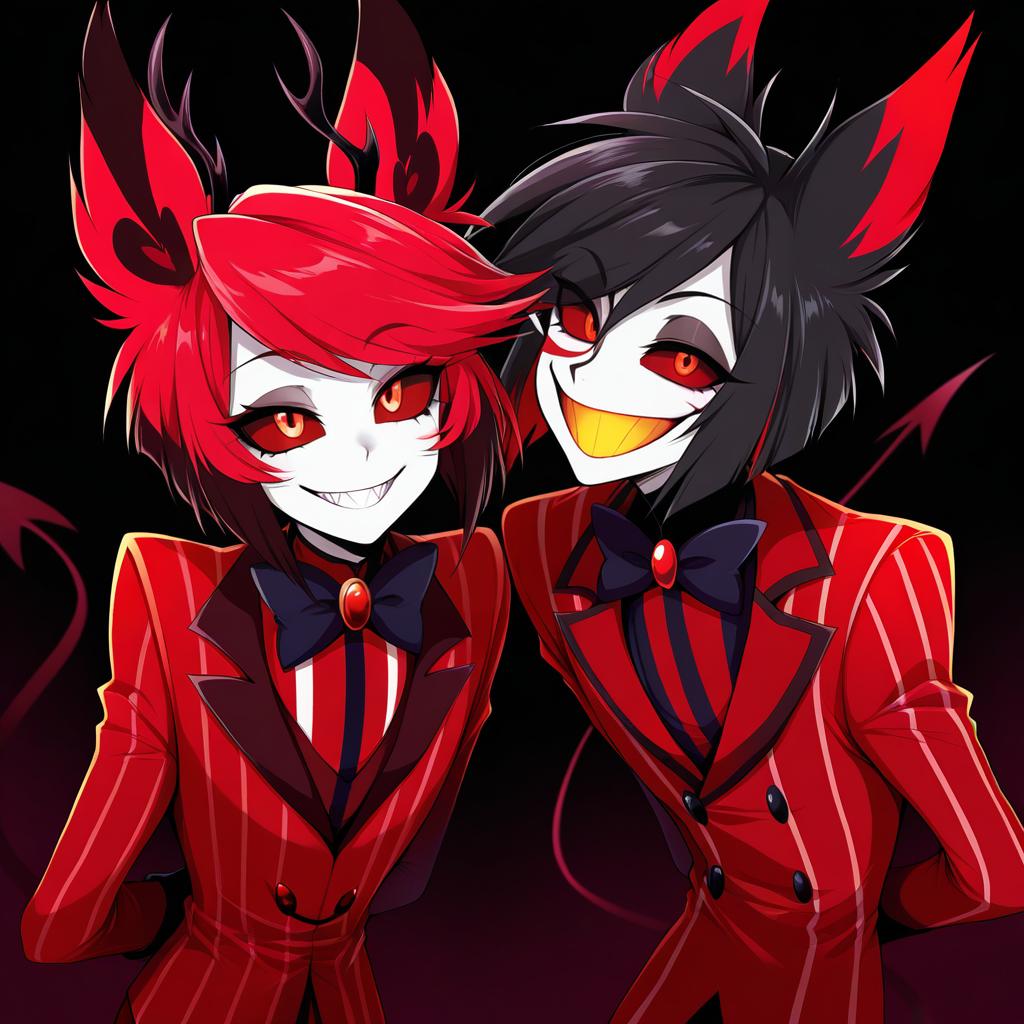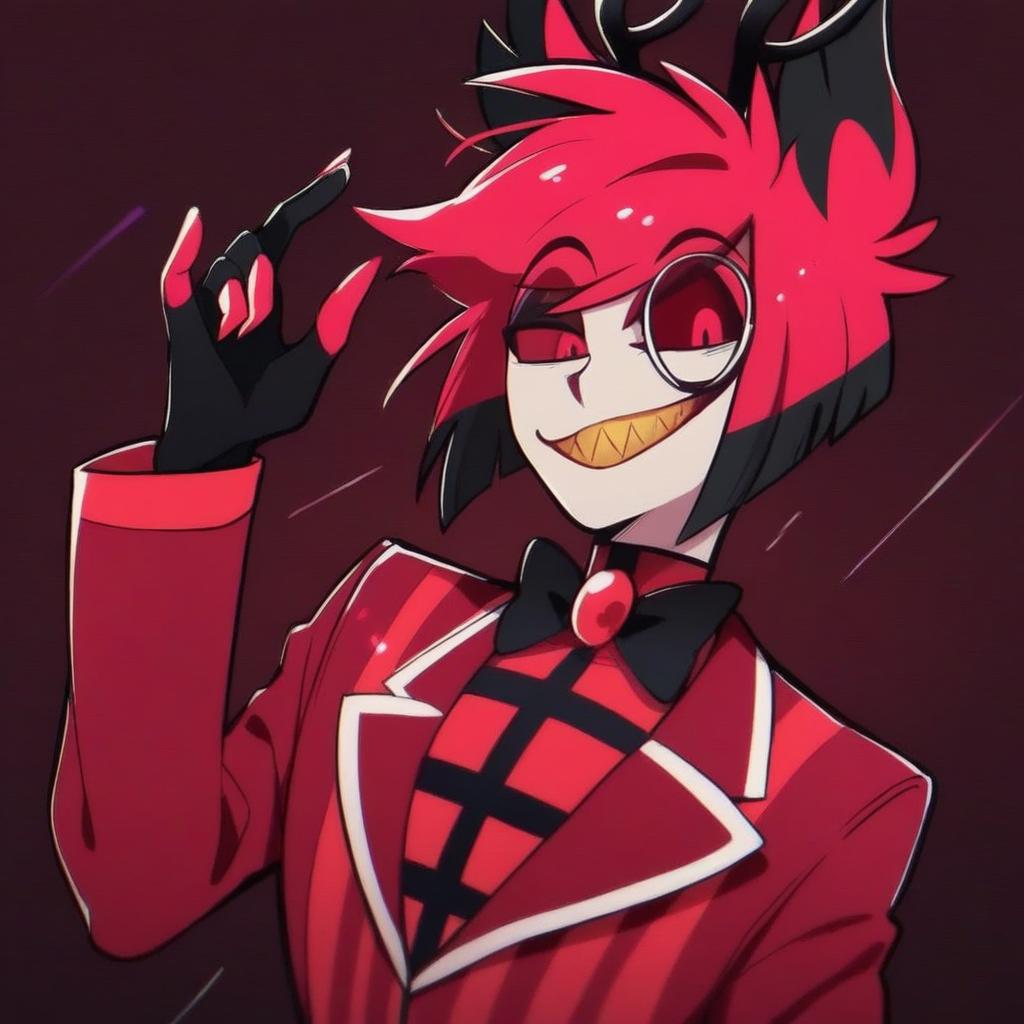 Alastor (hazbin hotel), hazbin hotel, 1boy, demon boy, demon, sharp teeth, horns, deer ears, yellow teeth, red eyes, red hair, short hair, black hair, red suit, suit, black bowtie, long sleeves, deer antlers, red sclera, deer boy, monocle, by artist yuuyuu (yuuki1771), anime