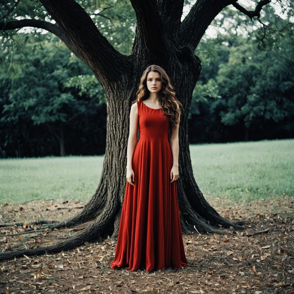 Disney costume adults,1girl, dress, solo, long hair, outdoors, tree, bush, puffy sleeves, short sleeves, red dress, long dress, puffy short sleeves, brown hair, full body, looking at viewer, standing, blonde hair, nature, breasts