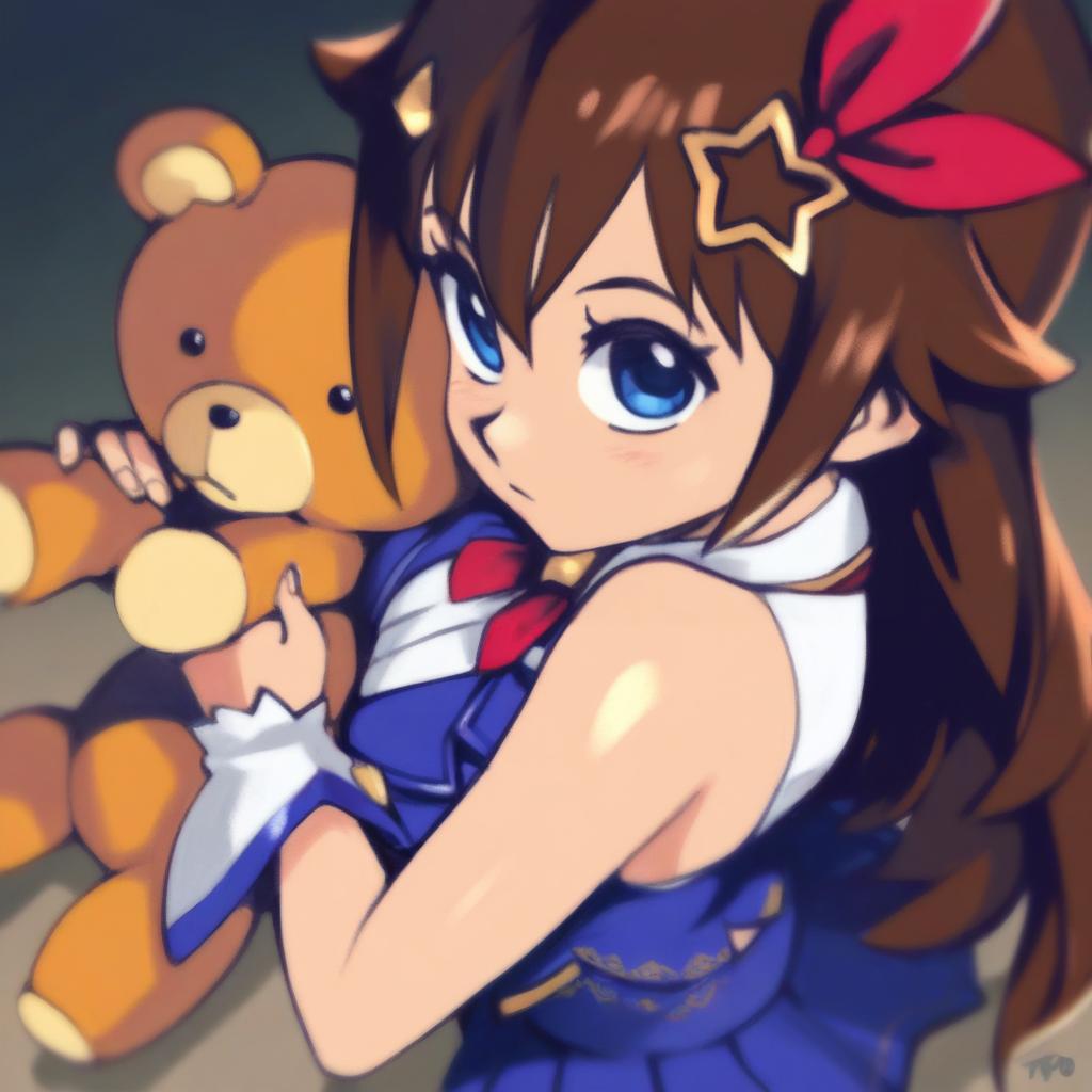 Ankimo (tokino sora), hololive, 1girl, blue eyes, hair between eyes, brown hair, long hair, star hair ornament, hair flaps, hair ribbon, hairclip, medium breasts, white shirt, pleated skirt, sleeveless shirt, red ribbon, virtual youtuber, virtual youtuber, teddy bear, by artist optionaltypo, leet