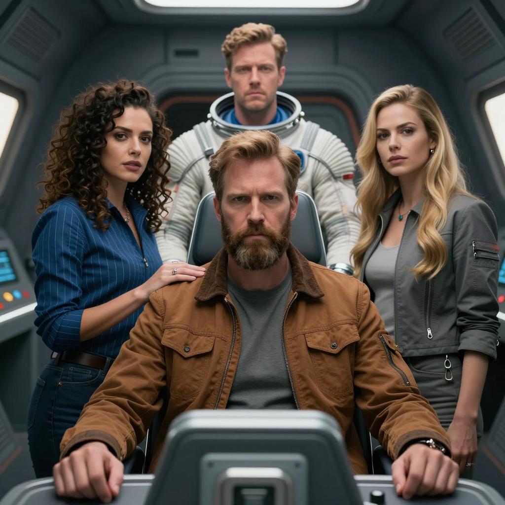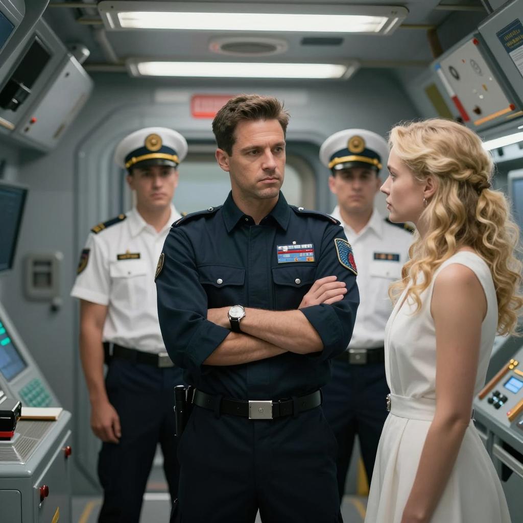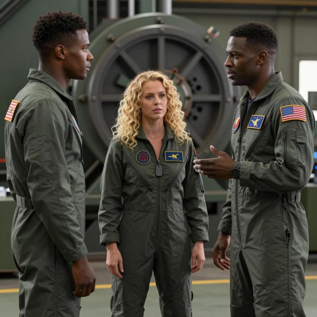 Three people in green military-style flight suits stand inside a dark, industrial room with large, circular machinery in the background. The woman in the center has blonde curly hair, light skin, and wears dog tags. The man on the right has dark skin, short hair, and gestures with his right hand. The man on the left has dark skin and is partially turned away. The man on the right's flight suit has an American flag patch and a red emblem. The woman's flight suit has a patch on the left shoulder.