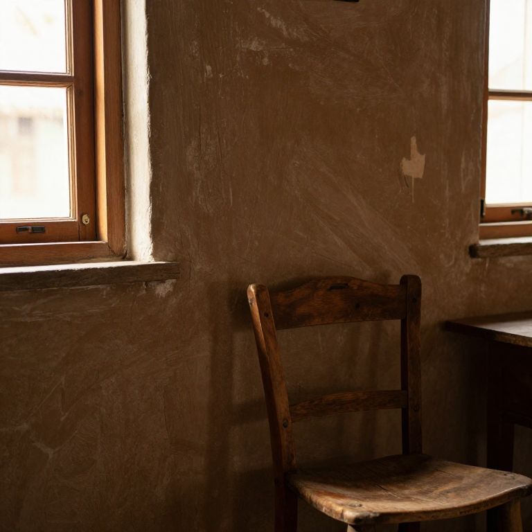 A close-up shot of a textured brown wall in a cozy countryside cottage, with warm afternoon sunlight filtering through wooden windows, showing subtle cracks and grain patterns; a weathered wooden chair sits nearby, and the wall has a slightly aged, rustic appearance with a few faded paint streaks.
