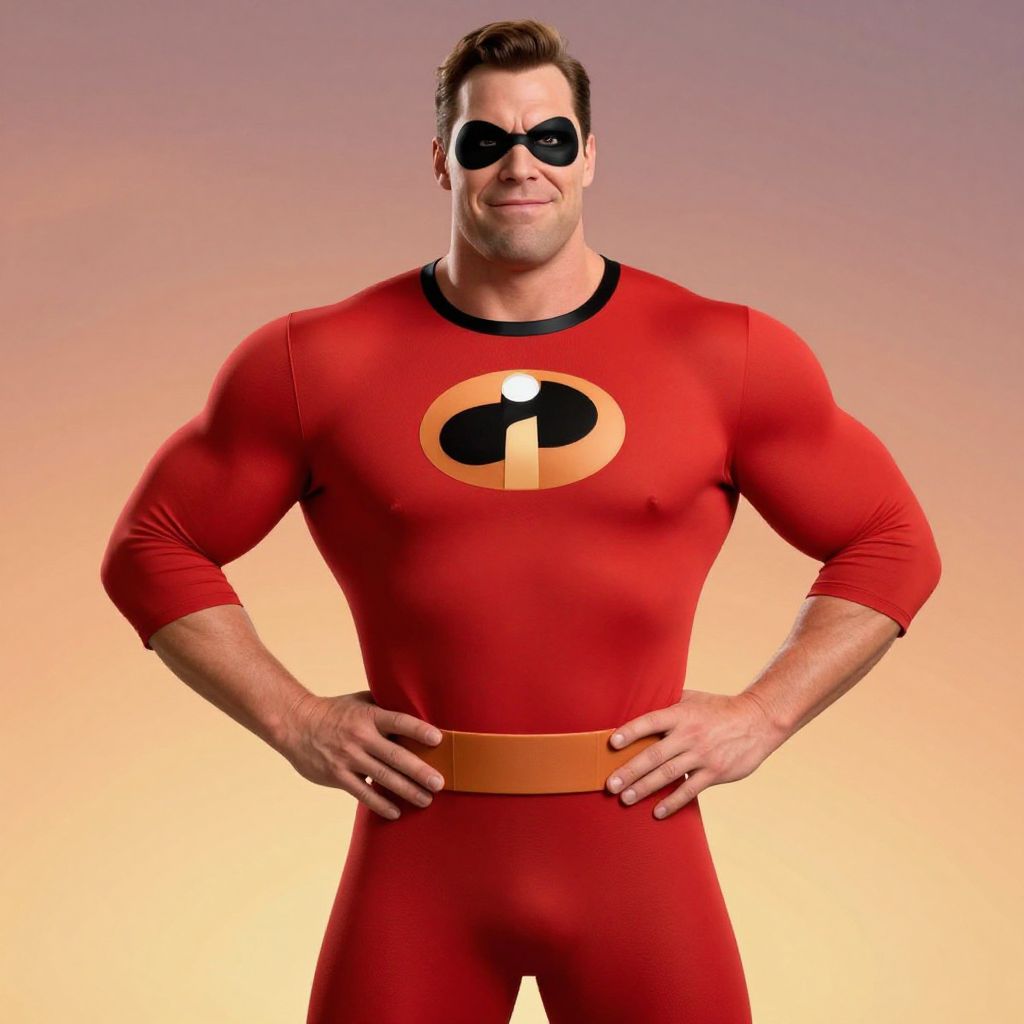 A man dressed in a realistic Mr. Incredible costume from the popular animated superhero film. The image captures him confidently posing with hands on hips, wearing the iconic red suit and black eye mask against a warm, gradient background.