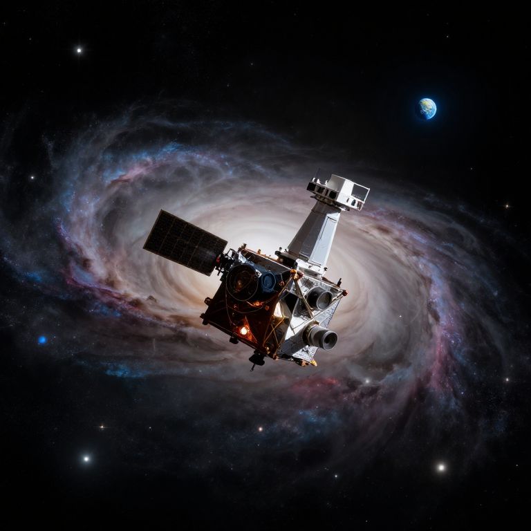 A stunning image of a deep space telescope floating in the vastness of space, surrounded by swirling galaxies and distant stars, with the Earth visible as a small blue dot in the distance.