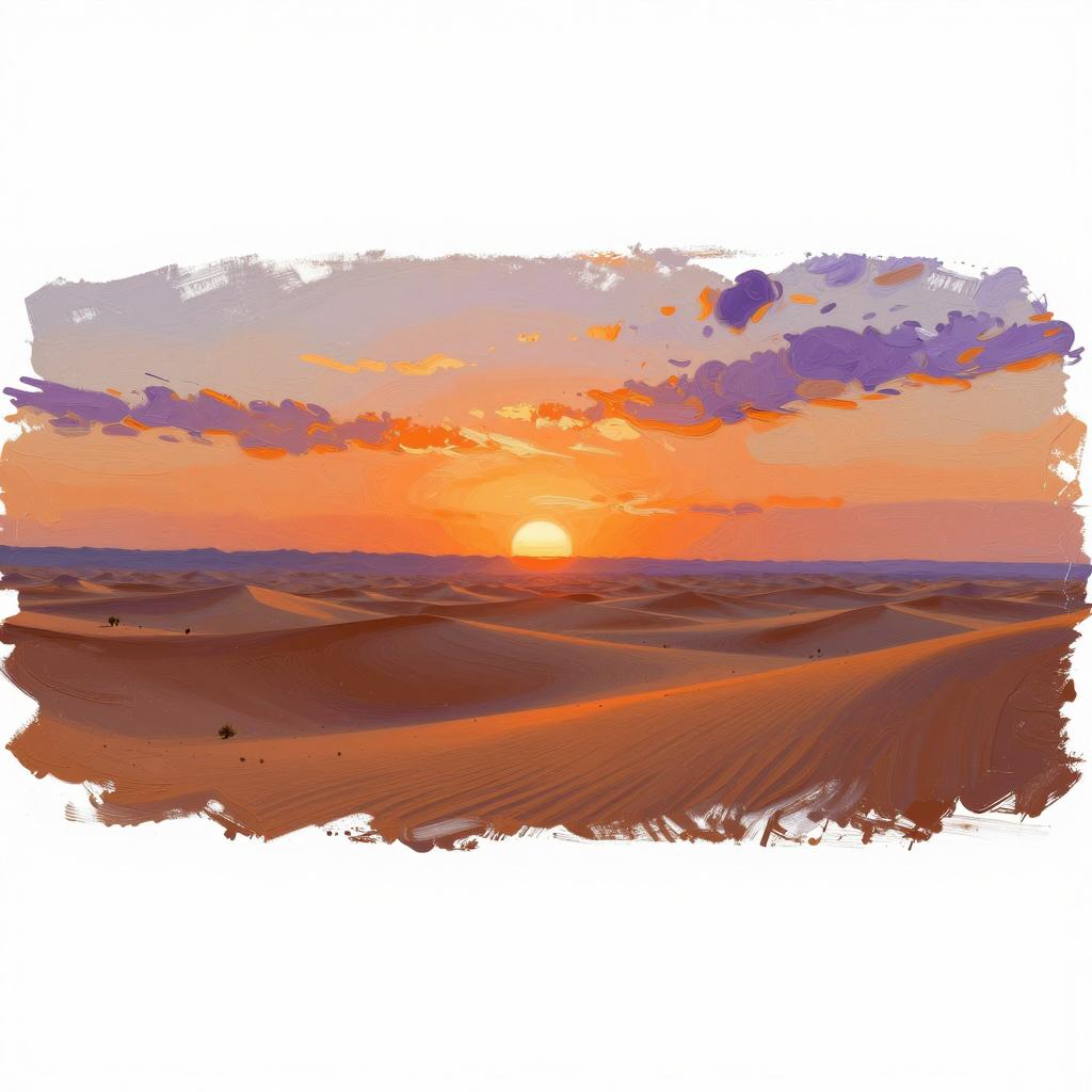 An exquisite illustration of Sunset over the Sahara desert, crafted in impressionist brushwork style with warm oranges and deep purples highlights, set against a vast white negative space, UHD, 16K, ultra-detailed.
