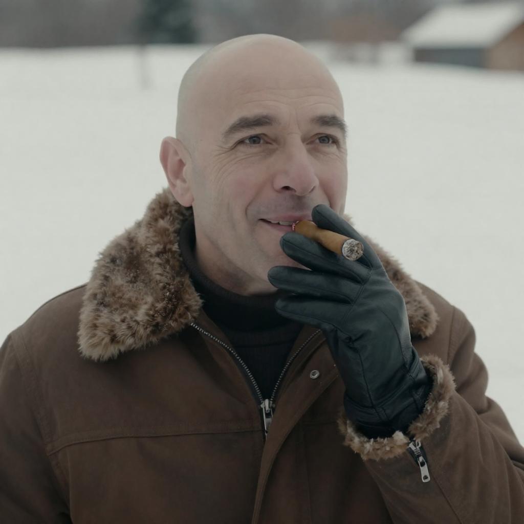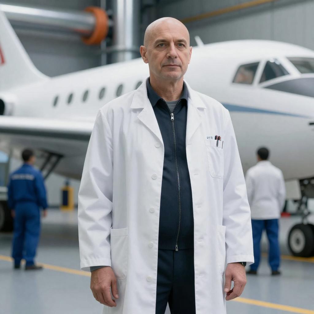 Middle-aged man with bald head, white lab coat, dark vest, standing in front of a large, futuristic aircraft. Background includes industrial setting with metallic tubes and orange components. Two workers in blue and white uniforms in the background.