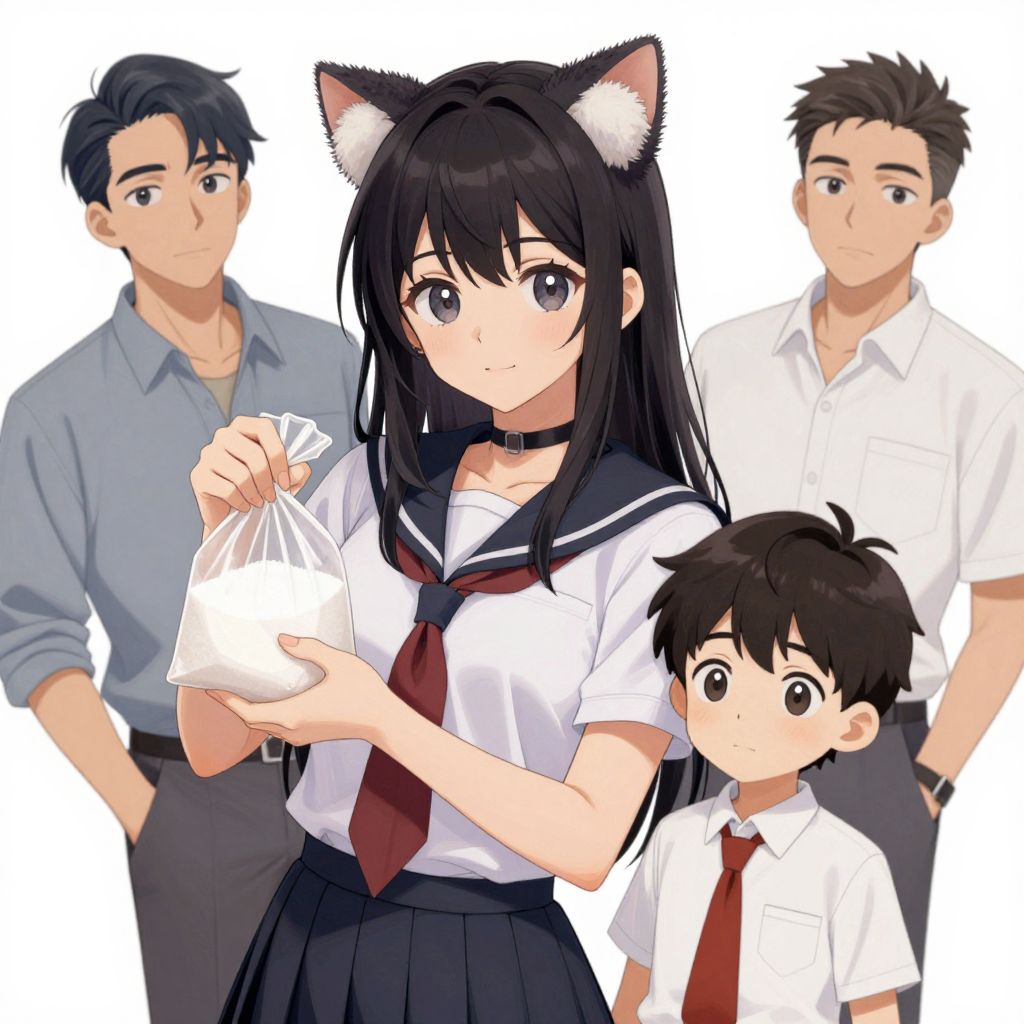 Anime woman with fluffy cat ears holding a bag of sugar, a little boy wearing white shirt and red tie, digital artwork, in the style of krenz cushart y eddie mendoza and tyler edlin