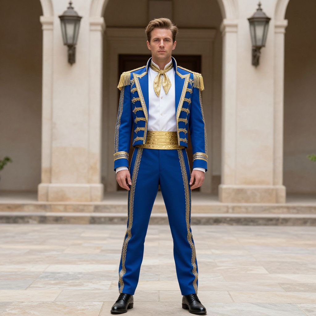 Eurovision Movie Costume, man dressed in a blue and gold outfit standing in a courtyard