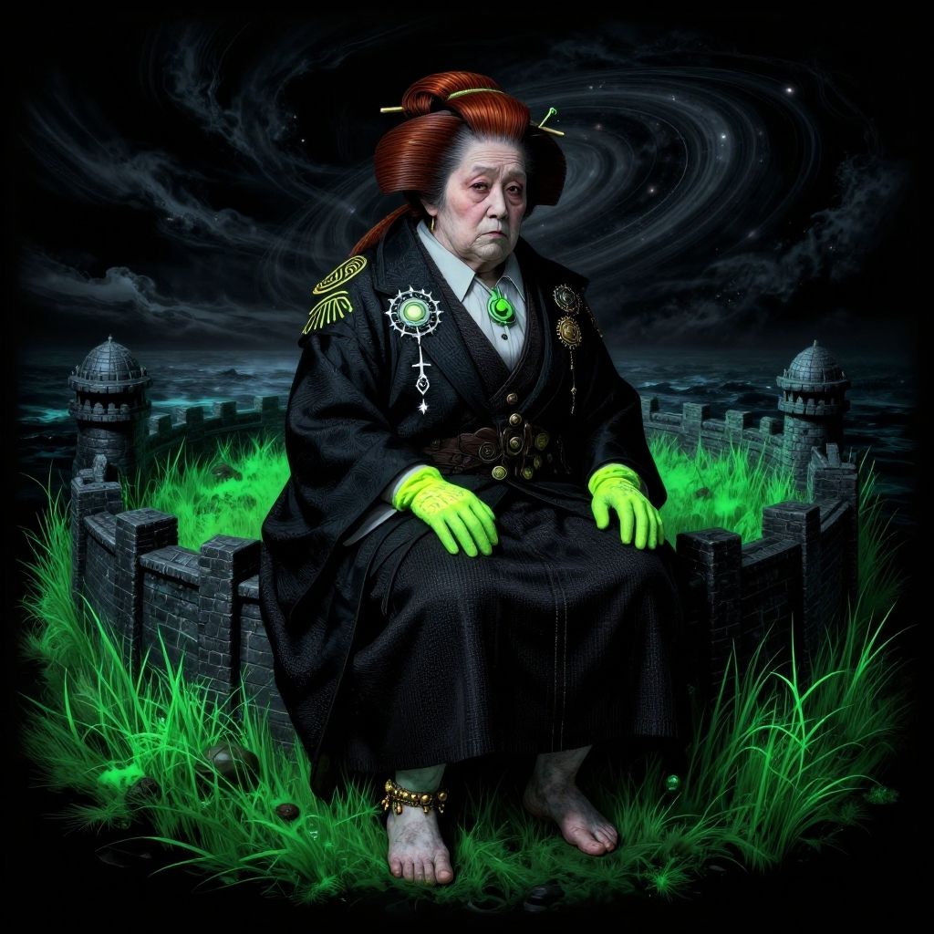 A digitally rendered image features an elderly Asian woman with pale skin and red hair in an elaborate updo. She wears a black kimono adorned with intricate gold embroidery, neon green gloves, and a green pendant. She sits on a grassy patch surrounded by a medieval-style stone wall and towers. The night sky in the background is dark with swirling clouds, adding a mystical atmosphere. Her expression is serious, and she is barefoot, with a gold anklet on her left ankle. The image has a surreal, fantasy-like quality with vivid contrasts between the neon green and dark background.