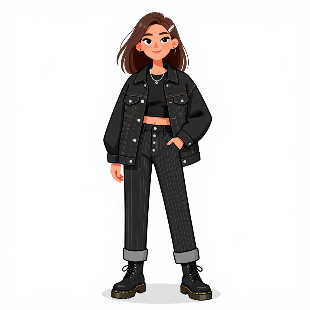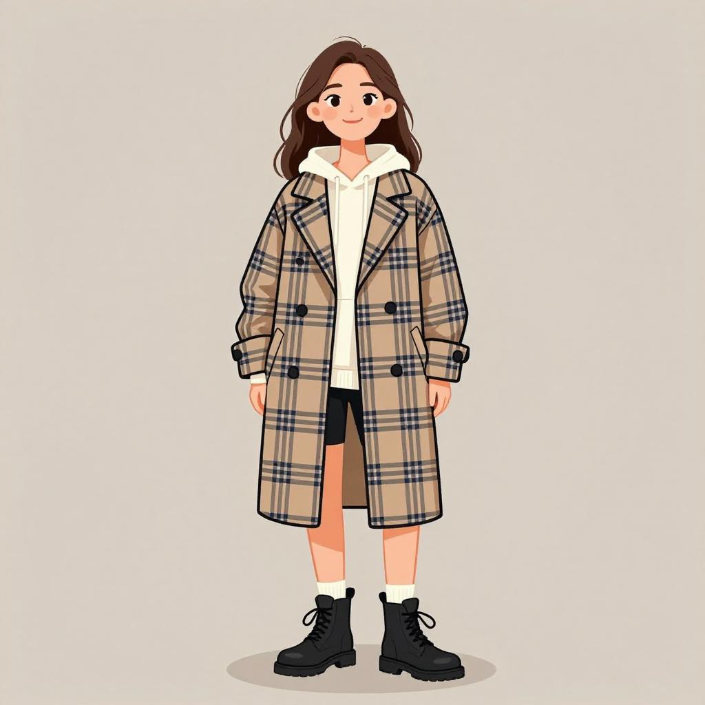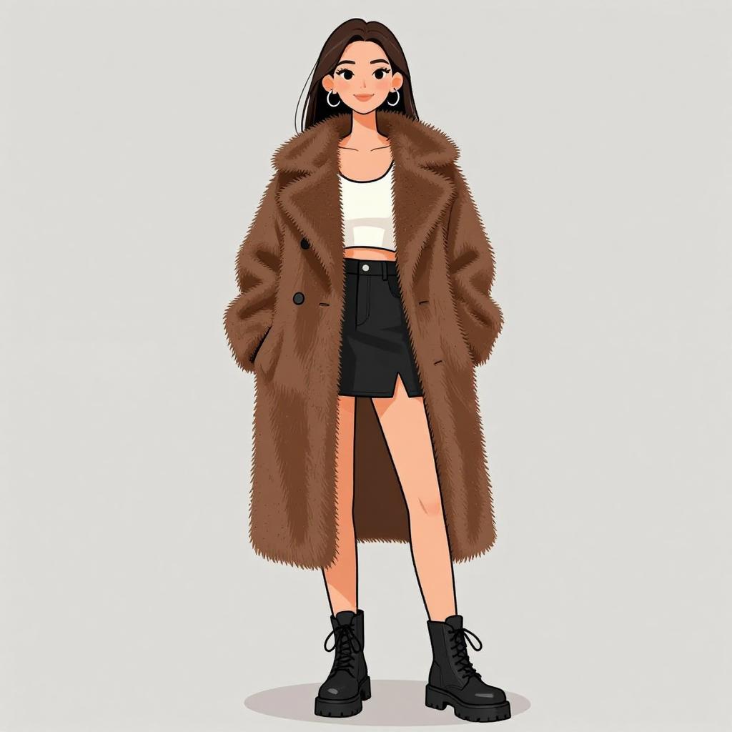 Woman with pretty face and pretty hair. smiling Woman, street style, oversized faux fur coat in deep brown, wide lapels, long sleeves, side pockets, mid-calf length, open front, layered over a ribbed white tank top, high-waisted black mini skirt with a front slit, chunky black lace-up boots with raised soles, minimalistic silver hoop earrings, straight hair pulled back, --sref 1467