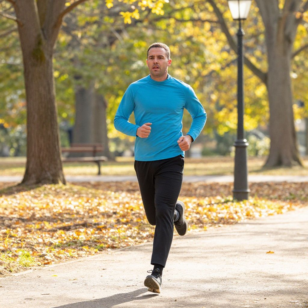 A photograph of a middle-aged man jogging in a park during autumn. He has a medium build, short dark hair, and light skin. He wears a bright blue long-sleeve shirt, black pants, and black running shoes. The park is filled with tall trees with yellow and green leaves, scattered with fallen leaves on the ground. A black lamppost stands in the background to the right. The sunlight filters through the trees, casting a warm glow. The man is centered in the foreground, looking determined with a slight smile. The path he is running on is slightly curved.
