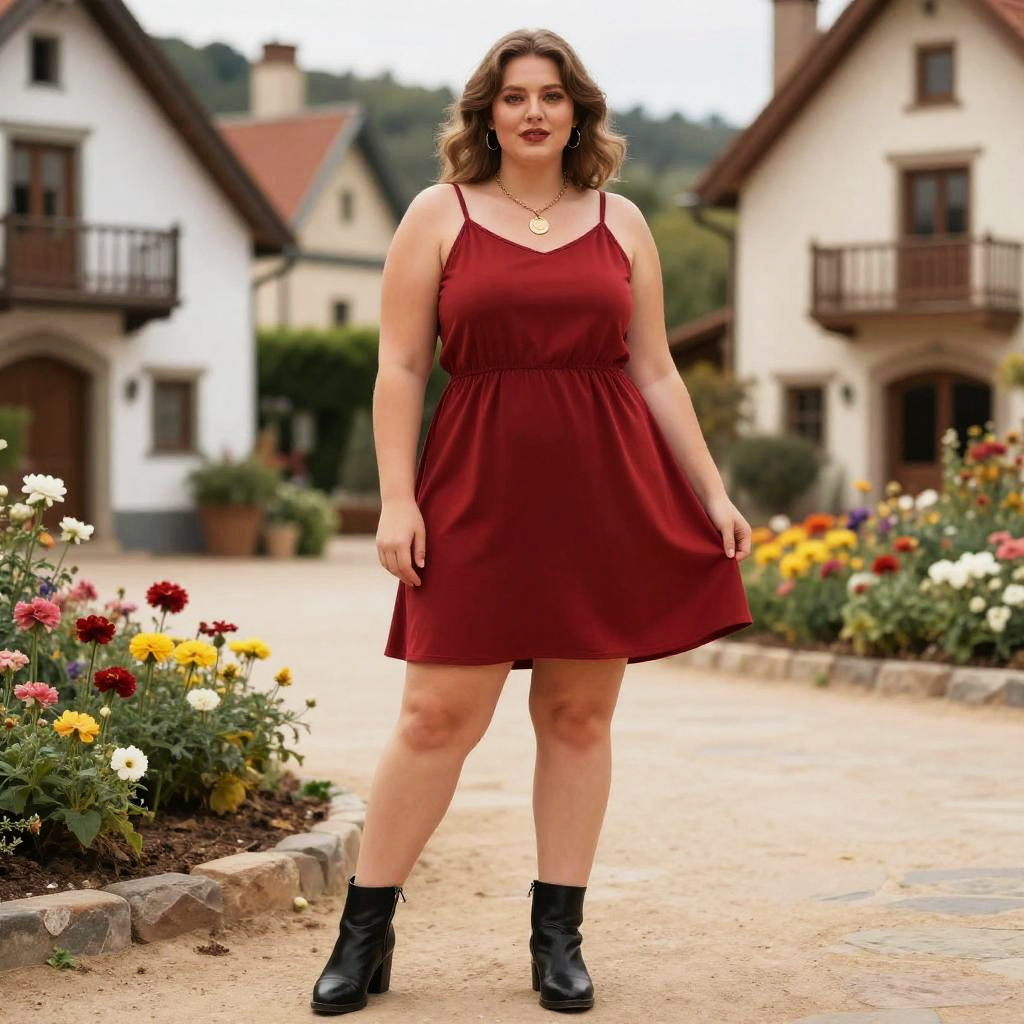 A lanky woman in a minimalist pale pink silk slip dress, knee-length with spaghetti straps, paired with black platform ankle boots and a simple black leather clutch, stands in a cozy mountain cabin with a garden, bathed in the warm hues of a sunrise. Her straight long hair with bangs cascades gently, complementing the serene atmosphere. Sexy. Pretty face and beutiful eyes