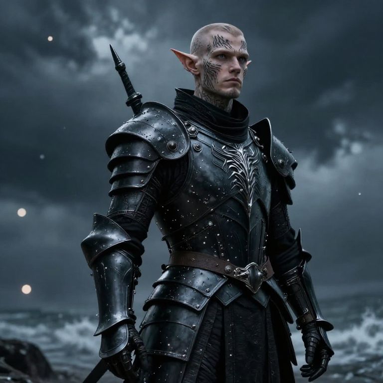 Male dhampir art, a brooding warrior with pale skin marked by vampire fangs and human resilience, dressed in dark tactical gear embellished with gothic patterns, set against a backdrop of an abandoned castle shrouded in storm clouds, moody and cinematic lighting, epic fantasy illustration.