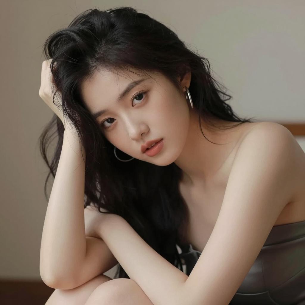 1girl, solo, black hair, head tilt, k-pop, looking at viewer, earrings, jewelry, hoop earrings, blurry, realistic, curly hair, blurry background, strapless, parted lips, bare shoulders, leaning to the side, photorealistic, dress, collarbone, black eyes, lips, arm up, sitting, hand on own head
