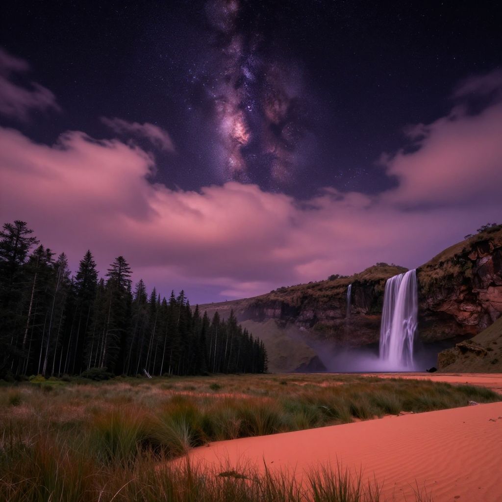 Photograph of a nocturnal landscape featuring a cascading waterfall on the right, illuminated by a soft purple and pink glow. The sky is adorned with a stunning Milky Way, speckled with stars. Silhouetted pine trees line the left, while a reddish-orange sand dune occupies the foreground. The waterfall's mist blends with the grassy field, creating a serene, otherworldly atmosphere. The vivid colors and sharp contrasts between the sand, water, and sky enhance the surreal beauty of the scene.