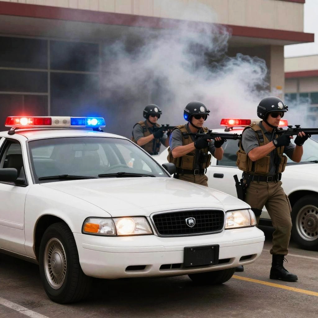 1980s SWAT officers storming a building, classic boxy squad cars with flashing red and blue lights, retro helmets and gear, smoky background, dynamic composition, hyper-realistic style