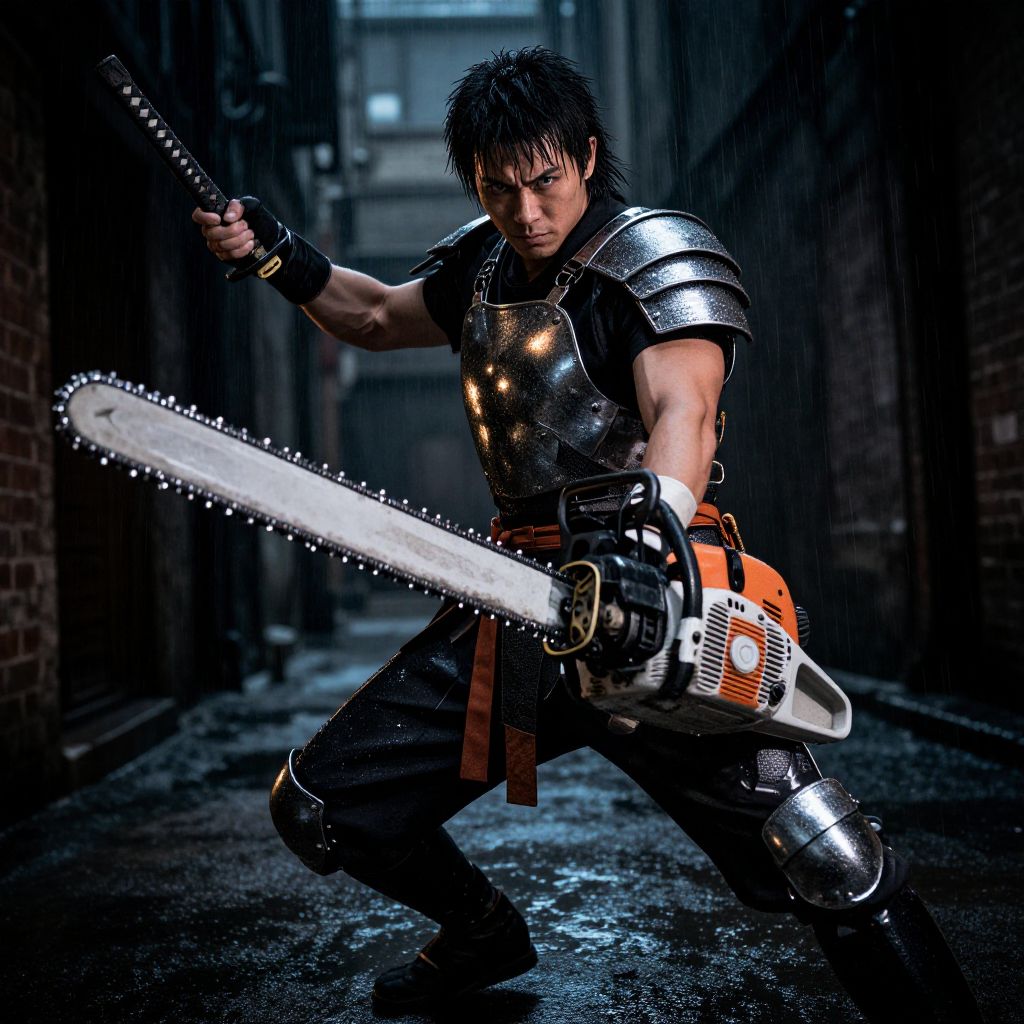 Katana man chainsaw man cosplay in a realistic photo with dramatic lighting and high detail, spotlight on sharp katana and roaring chainsaw, realistic facial expressions, detailed reflections on armor, deep shadows, ultra-fidelity textures, cinematic combat pose in rainy alley