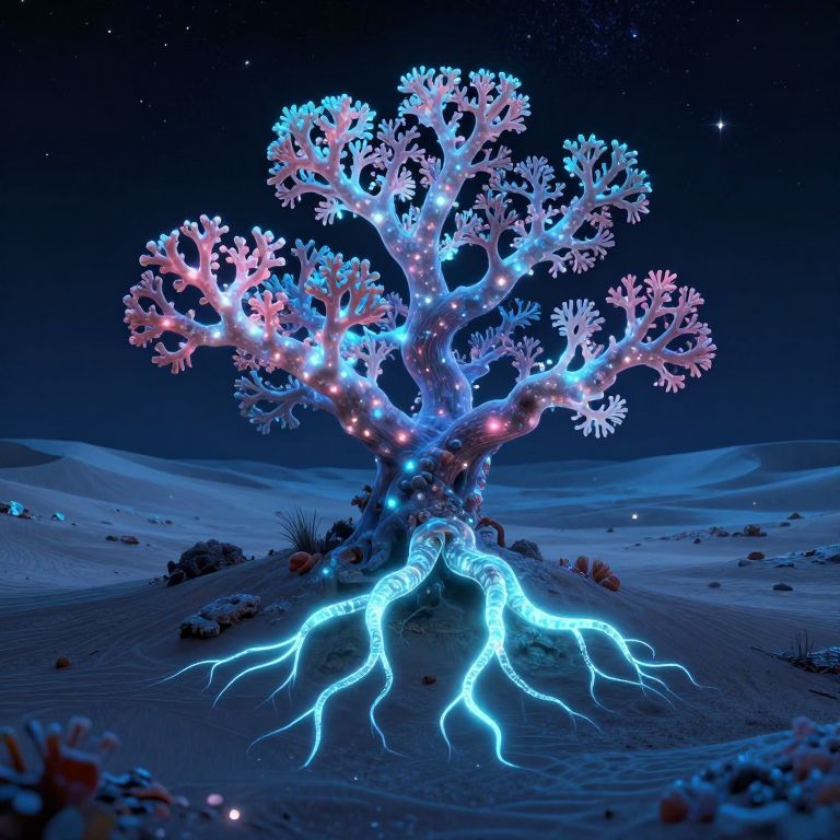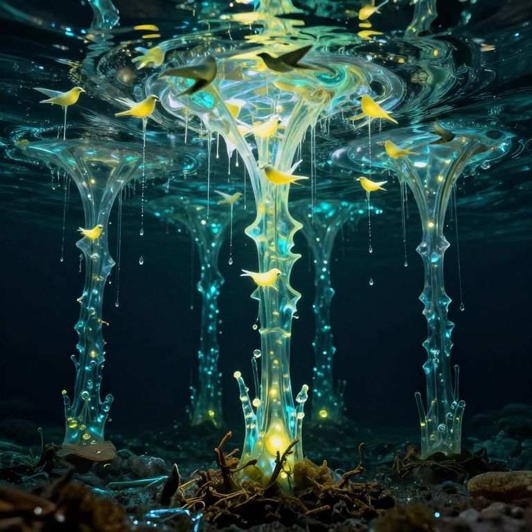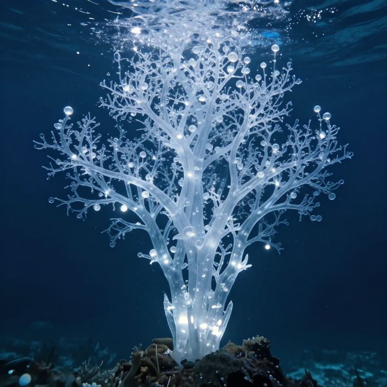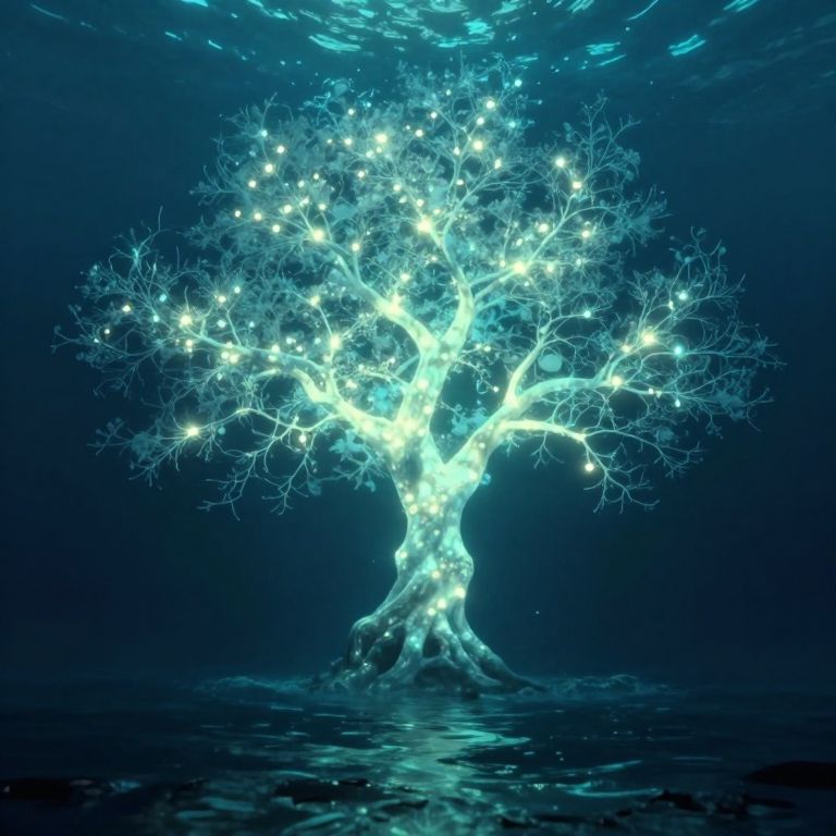 A luminous, ethereal tree of crystalline branches emerges from the ocean floor, its translucent limbs adorned with glowing orbs that cascade upward like a living, bioluminescent fountain, defying gravity in a surreal aquatic realm.