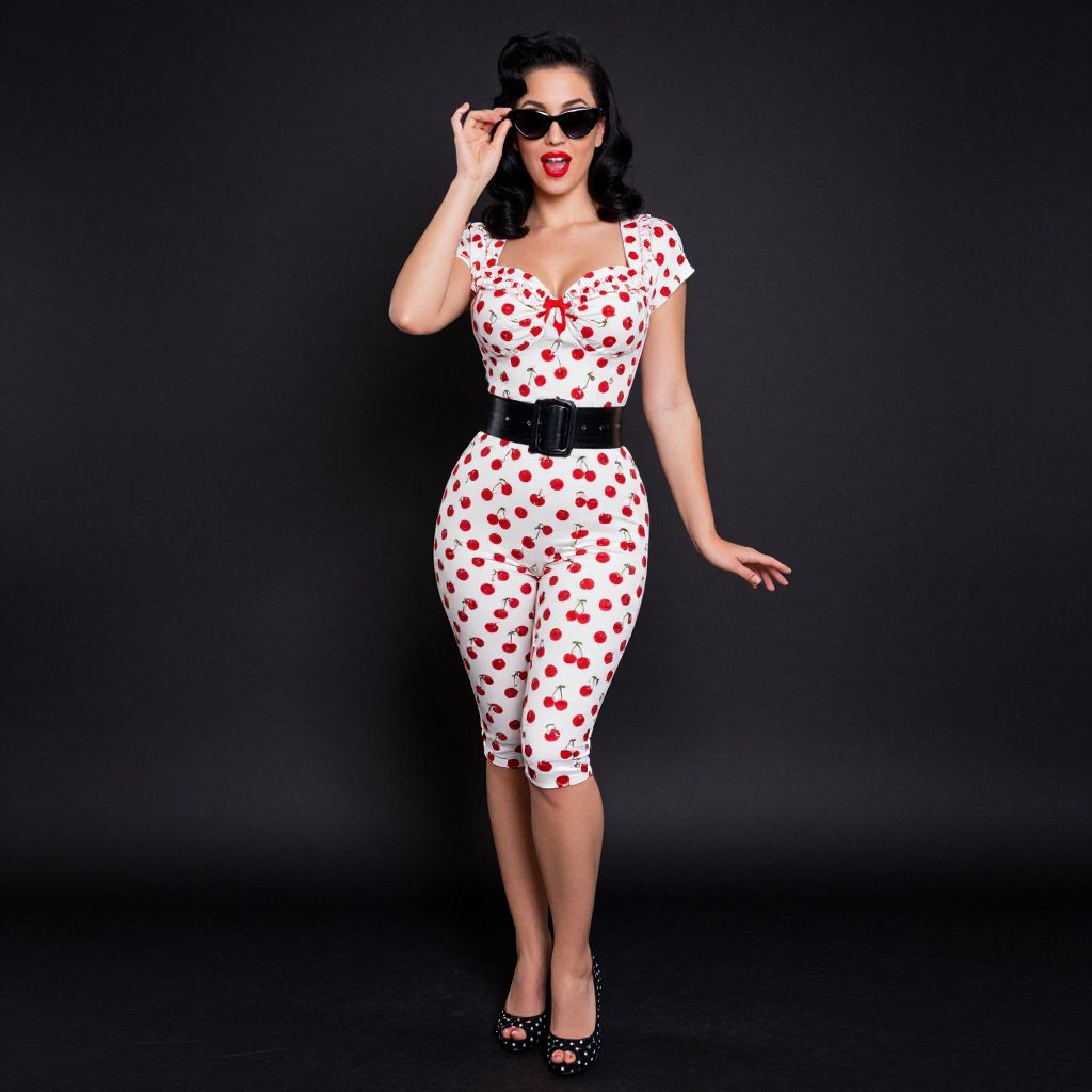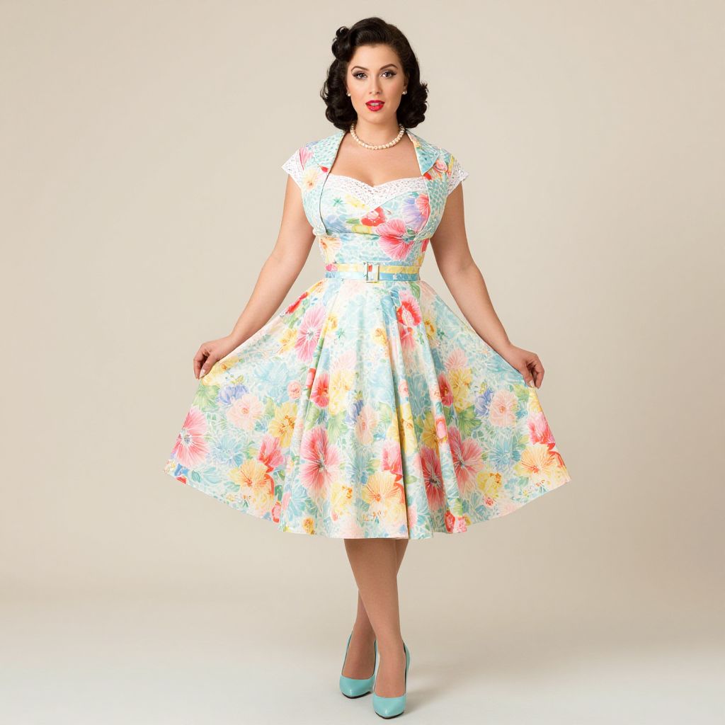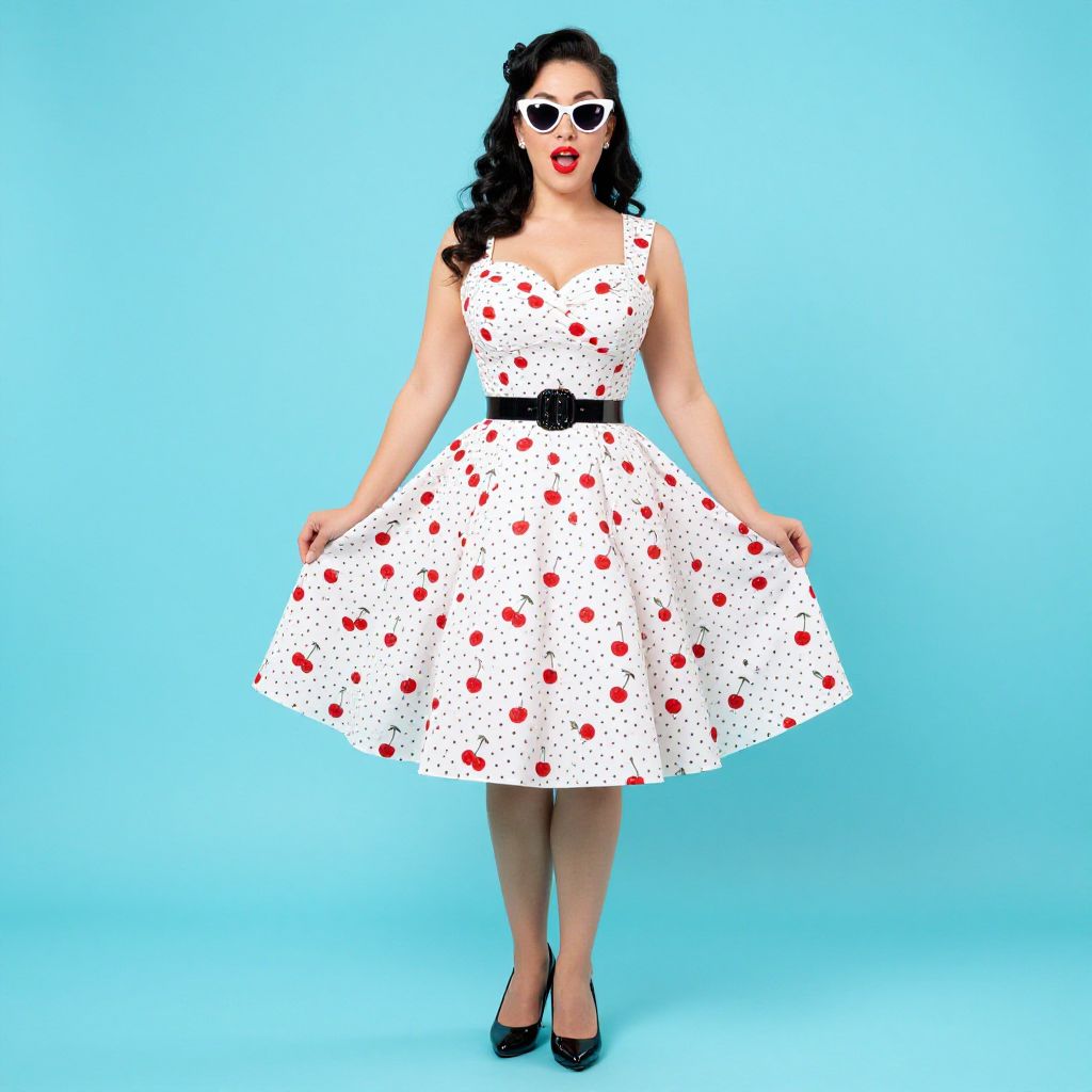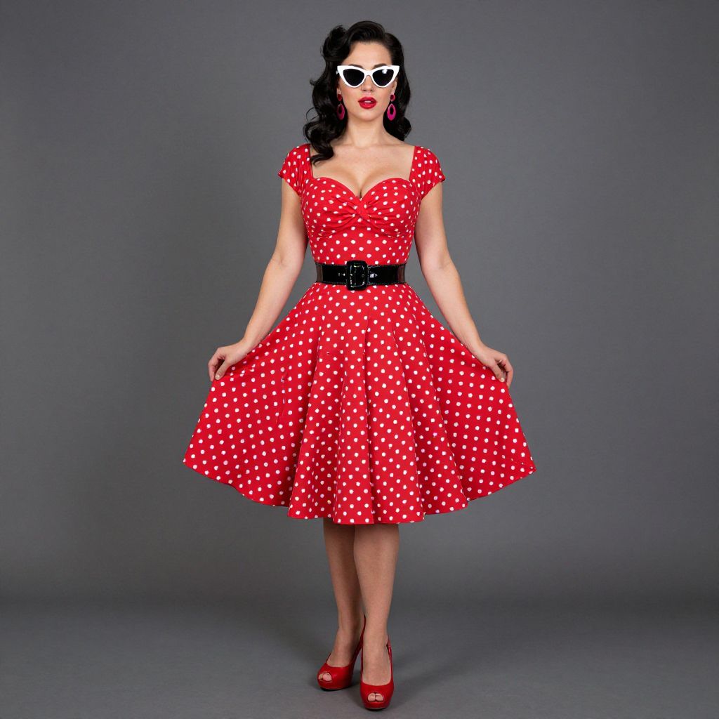 Full body shot, Pear-shaped body type woman, rockabilly pin-up dress, vibrant cherry red fabric, sweetheart neckline, fitted bodice, flared skirt, knee-length hem, layered tulle petticoat, polka dot pattern, wide black belt, vintage-inspired, short cap sleeves, retro style, high-waisted, playful and flirty, classic cat-eye sunglasses, red lipstick, black patent leather pumps, bold accessories, playful hairdo with victory rolls Sexy. Pretty face and beаutiful eyes. Big breasts