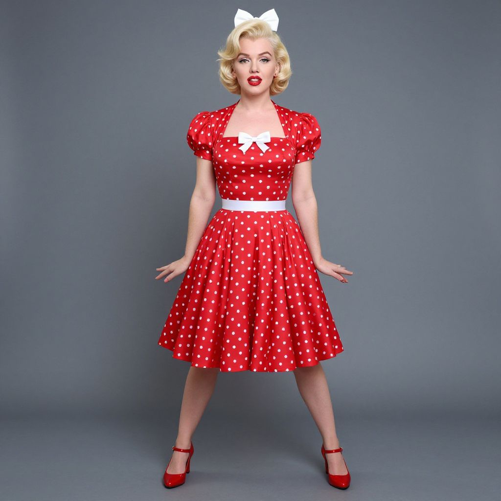Photograph of a curvy woman with fair skin, wearing a red vintage dress with black polka dot tulle, black belt, black heels,