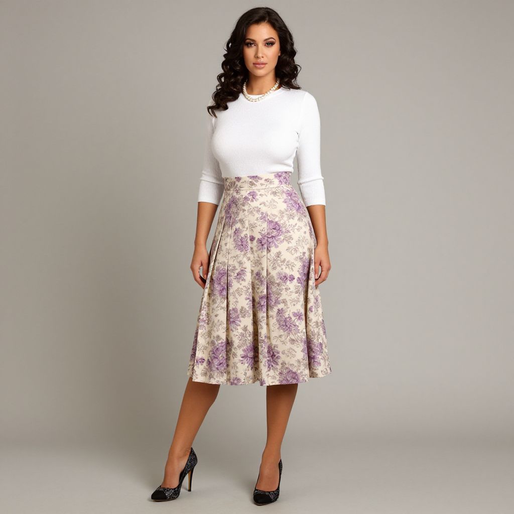"Woman, vintage-inspired, white fitted crewneck sweater, three-quarter sleeves, high-waisted A-line midi skirt with floral pattern, colors predominantly cream and lilac, pleated, black heeled pumps with matching floral detail, pearl necklace, waves in hair, neutral isolated background.. Sexy. Pretty face and beаutiful eyes. Big breasts."