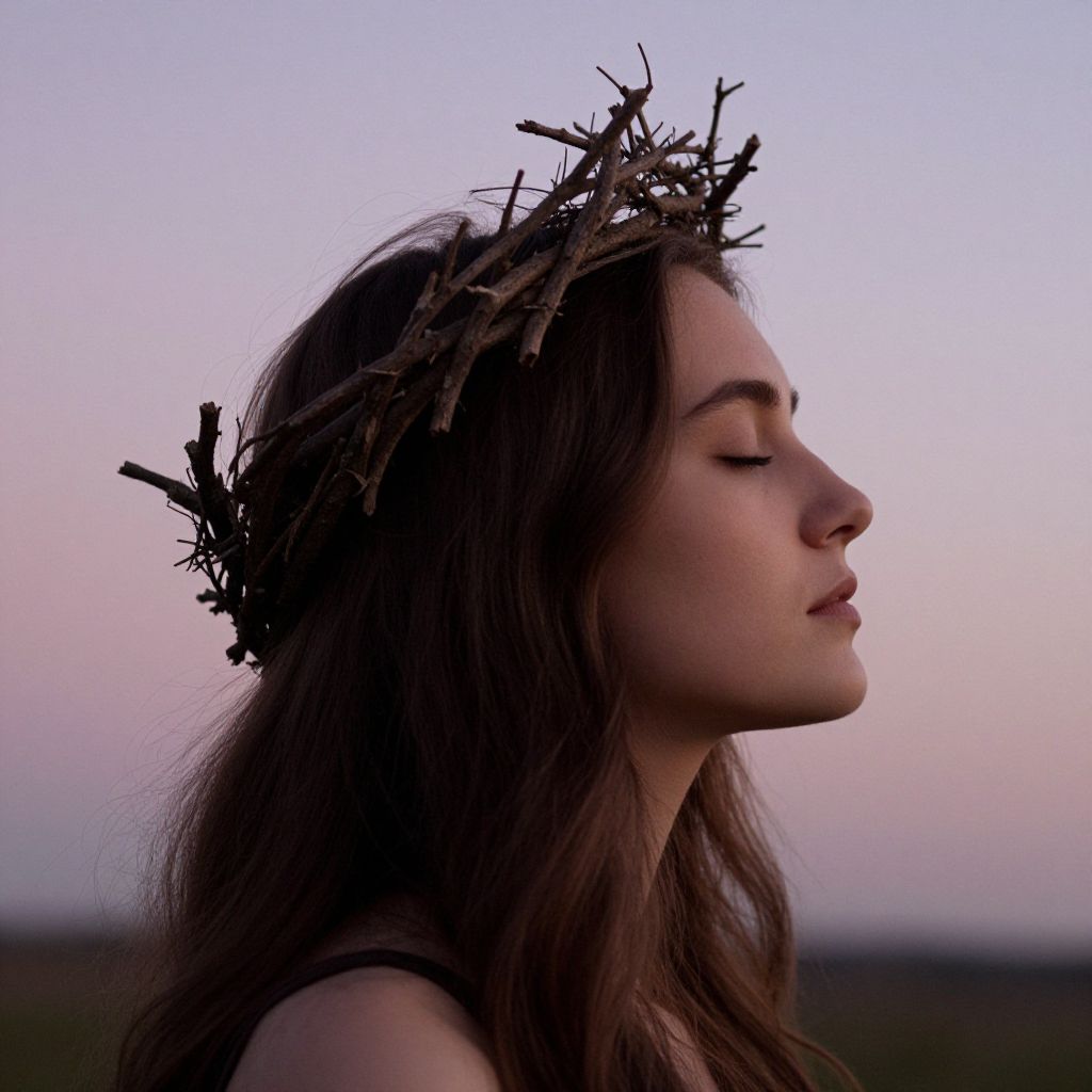 Photograph of a young woman with closed eyes, wearing a twig crown, against a twilight sky. She has long brown hair and a serene expression.