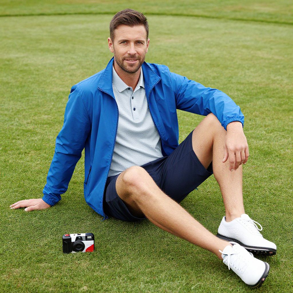 A man, royal blue windbreaker, light gray performance polo, dark navy golf shorts, stylish white golf shoes, lush green fields, disposable camera style, relaxed smile, enjoying a sunny day. Man has masculine face and piercing eyes