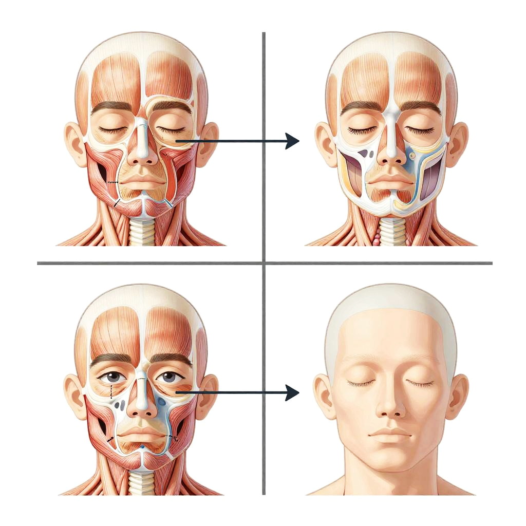Fix face medical infographic style, step-by-step diagram of facial reconstruction process, clean minimalist design, soft color palette with anatomical accuracy, highlighting key facial muscles and skin layers, educational and visually appealing