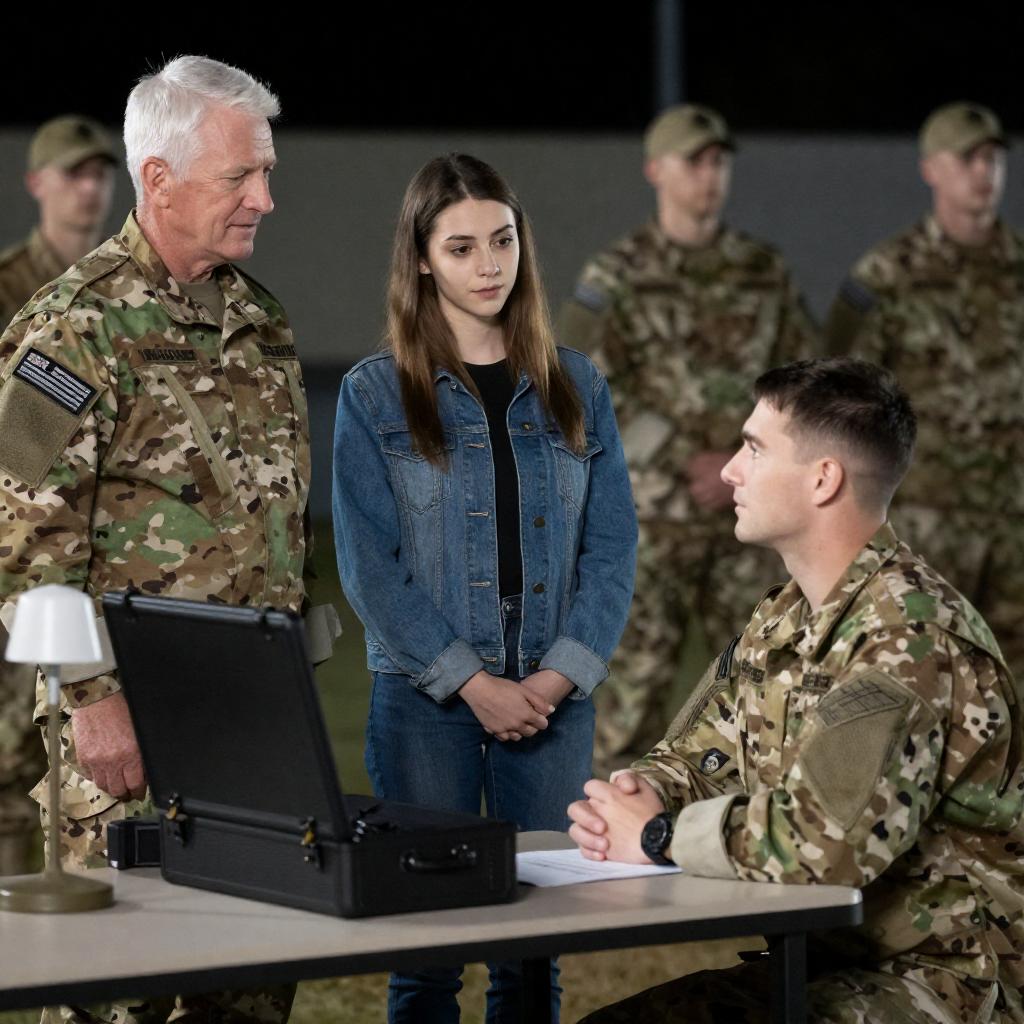 Photograph of four people in military uniforms. Three men and one woman, all with light skin, short hair. Central young man with light brown hair smiles, holding a tall glass with whipped cream. Woman on left looks at him, smiling. Two older men on right look at the glass, one with dark hair slightly smiling, the other with blond hair in profile. Background blurred.