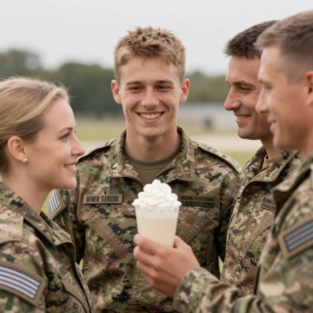 Four soldiers in camouflage military uniforms standing outdoors, comprising three men and one woman all with light skin and short hair. The central young man with light brown hair smiles broadly while holding a tall glass topped with whipped cream. The woman on the left looks at him, smiling warmly. Two older men on the right, one with dark hair and the other with blond hair, also look at the glass with smiles. Background is blurred, emphasizing the group interaction.