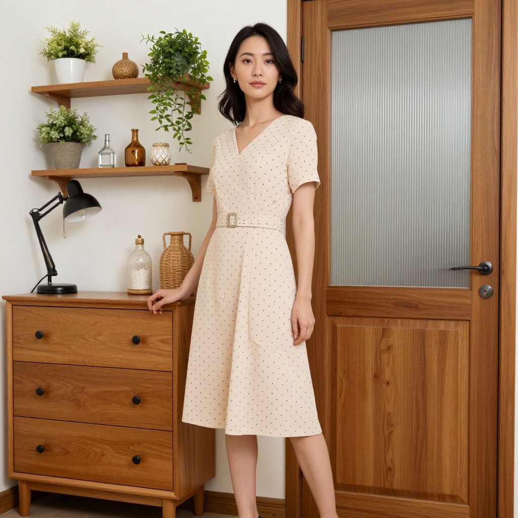 Woman standing gracefully in a light beige polka-dot dress with a belt, positioned beside a wooden door with vertical blinds, while a cozy interior setting features two wooden shelves above a three-drawer dresser, adorned with potted plants, decorative items, and a black desk lamp.