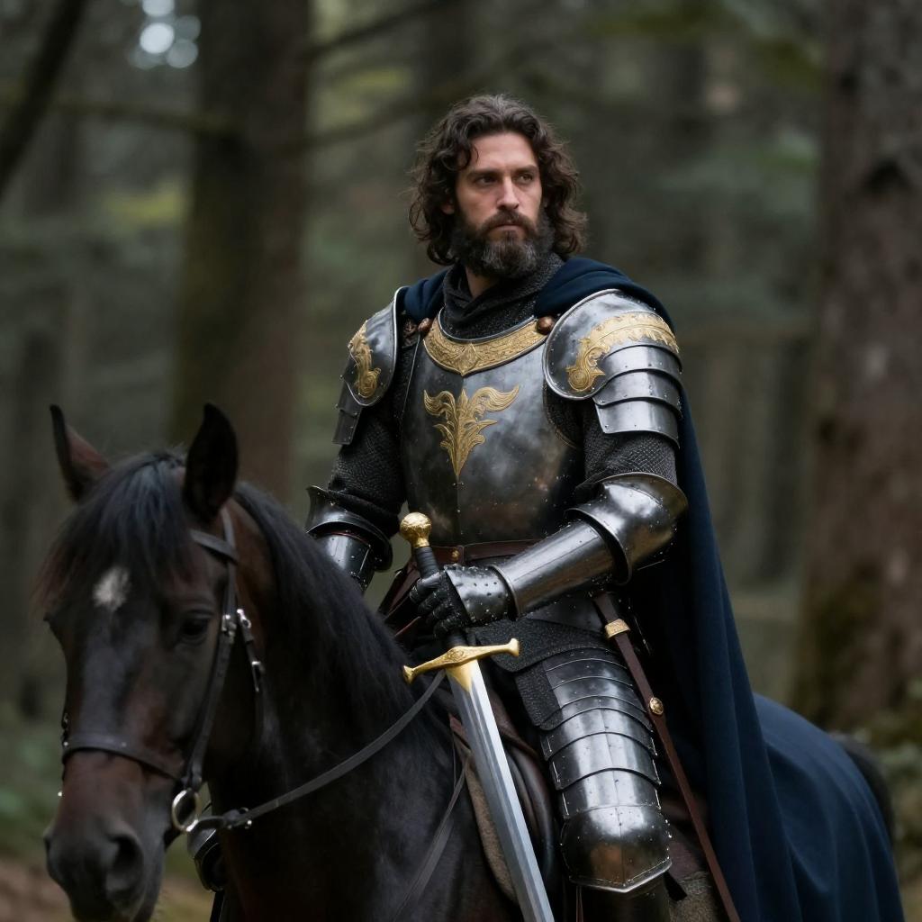 A photograph of a bearded man with dark hair, wearing medieval-style armor with gold and silver accents, and a dark blue cloak. He sits on a black horse in a dense forest, holding a sword with a golden hilt. The background features tall, blurred trees. The man's expression is serious and focused.