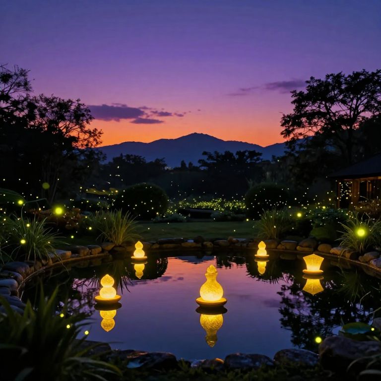 Photograph of a tranquil garden at dusk, showcasing a small, reflective pond with five glowing, yellow lanterns floating on the water. The sky transitions from deep purple to vibrant orange near the horizon, with silhouetted mountains and trees framing the scene. String lights and small, scattered lanterns add a whimsical glow around the pond, which is bordered by rocks and greenery. The water mirrors the lanterns and sky, enhancing the serene ambiance. The overall composition evokes a peaceful, magical atmosphere with a harmonious blend of natural and artificial light.