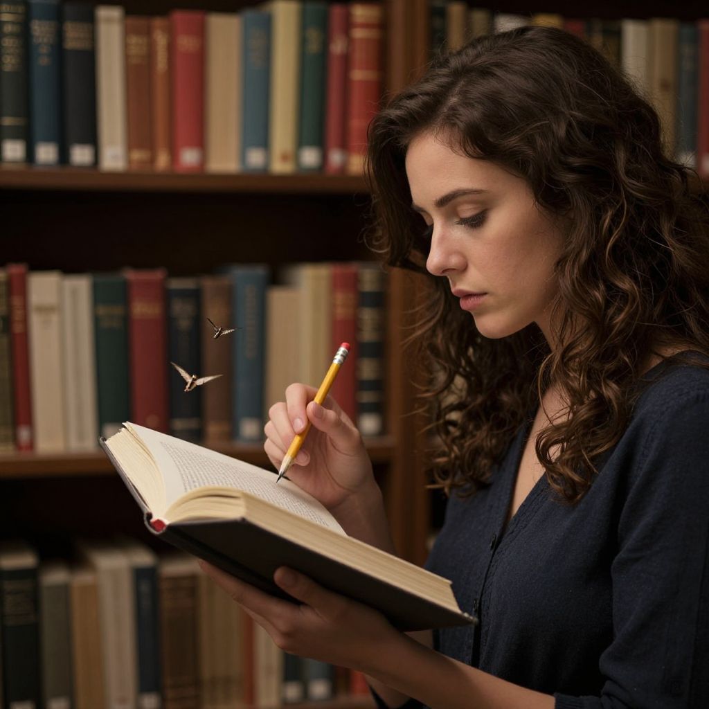 Photograph of a young woman with wavy brown hair, wearing a dark blue, long-sleeved shirt, standing in a library. She is focused on an open book, holding a pencil and writing in it. Her expression is concentrated. The background features tall, filled bookshelves with a variety of colored books. The lighting is soft, highlighting her face and the book. Small, delicate butterflies are subtly visible around her, adding a whimsical touch to the scene. The overall mood is serene and scholarly.