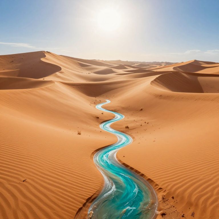 This is a vibrant, high-contrast photograph of a desert landscape featuring a winding, turquoise river cutting through undulating, orange sand dunes under a bright, white sun. The sun is positioned at the top center, casting strong shadows across the rippled sand. The river's clear, blue-green water contrasts sharply with the warm, sandy terrain. The sky above is a clear, bright blue with a few scattered white clouds. The textures of the sand dunes are prominent, with visible ripples and small rocks scattered across the scene. The image evokes a sense of arid beauty and serene isolation.