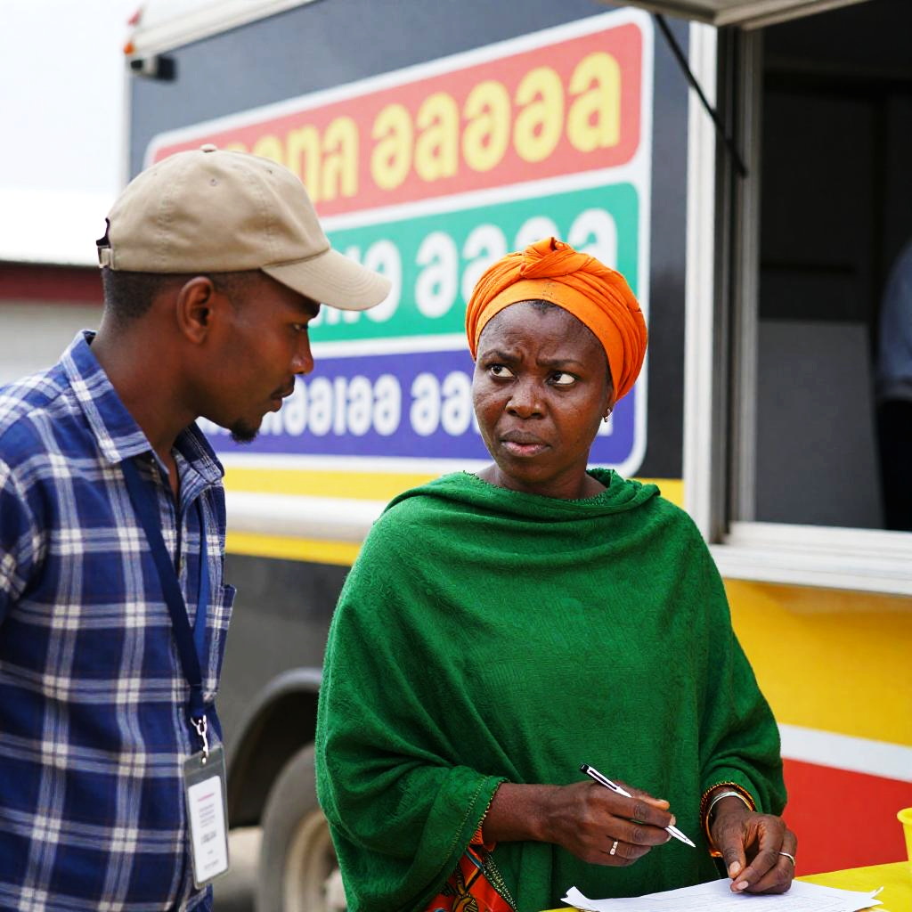 Photograph of two people at a food truck. A man in a blue plaid shirt and tan hat leans forward, looking at a woman in an orange turban and green shawl. She has intense expression, holding a pen. Food truck with colorful signs in background. Man wears lanyard with ID. Bright, outdoor setting.