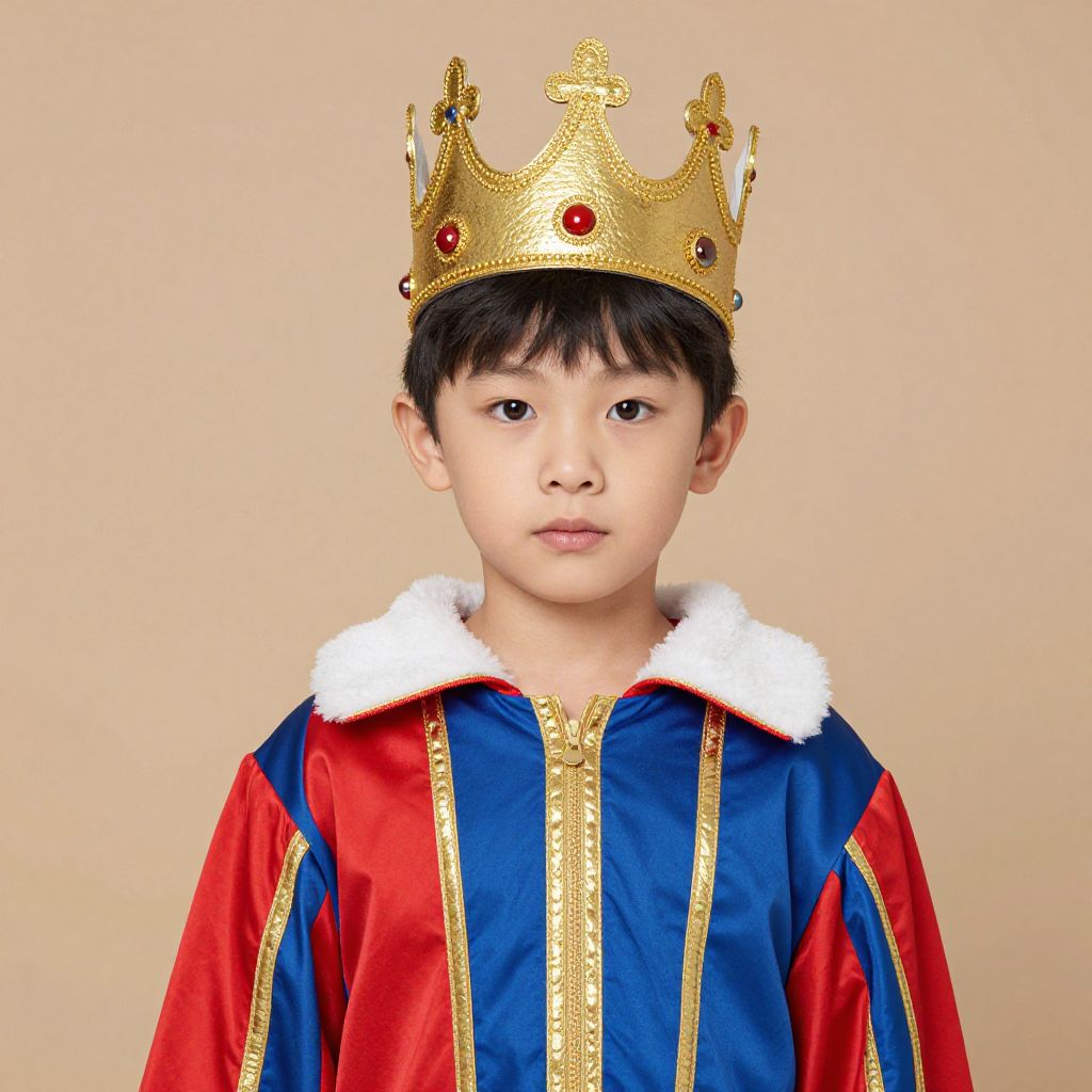 King Fancy Dress, child dressed in a red and blue costume with a gold crown
